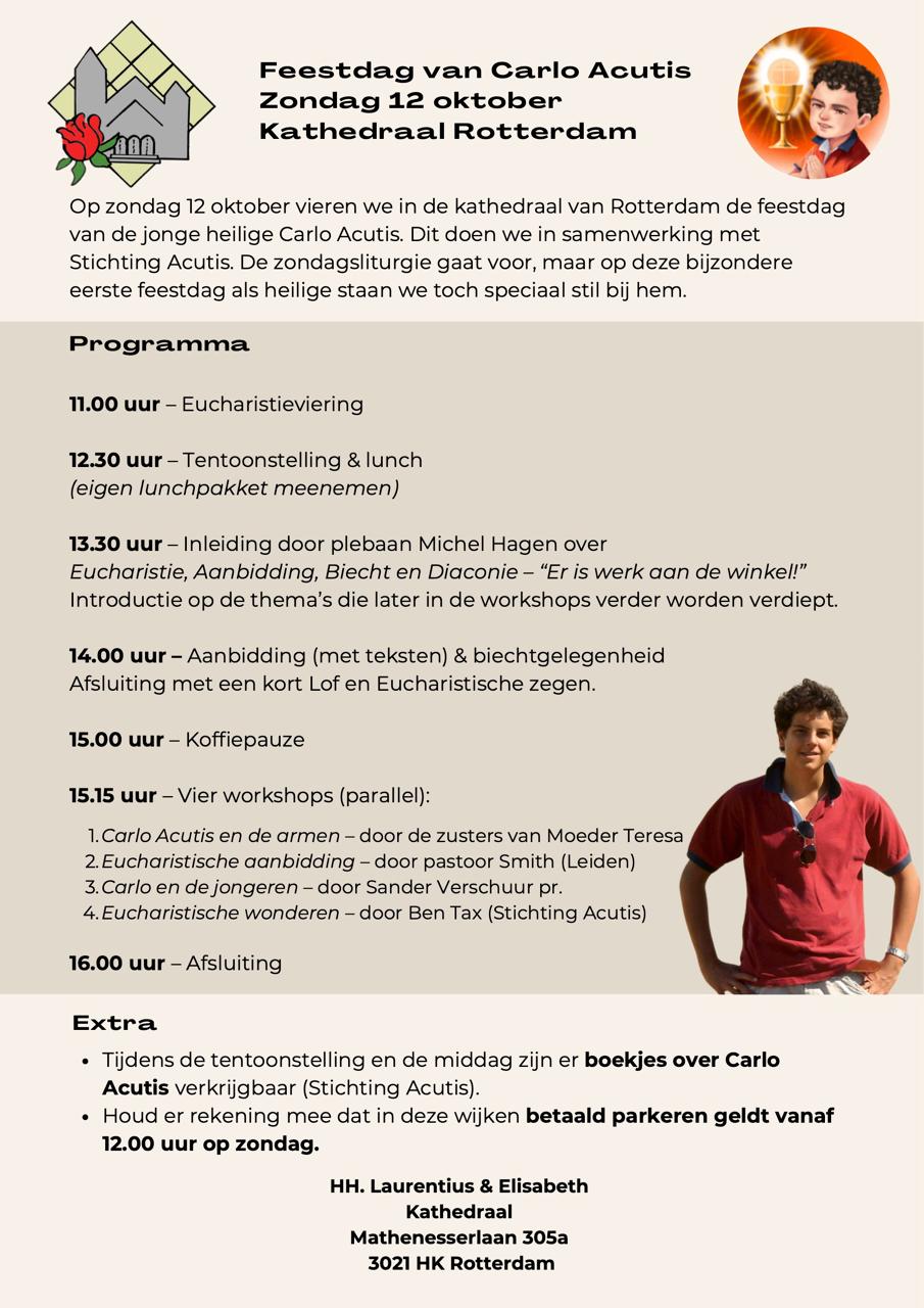 Op zondag 12 oktober is het de feestdag van de heilige Carlo Acutis! Zijn eerste liturgische gedachtenis als heilige. Omdat het een zondag is, moet zijn liturgische gedachtenis wijken voor de zondagsliturgie. Maar op deze eerste datum van zijn feestdag wordt er in de kathedraal van Rotterdam toch extra aandacht aan deze jonge heilige geven.