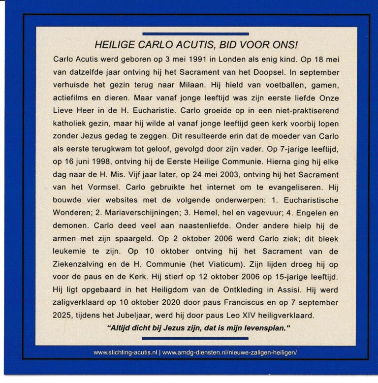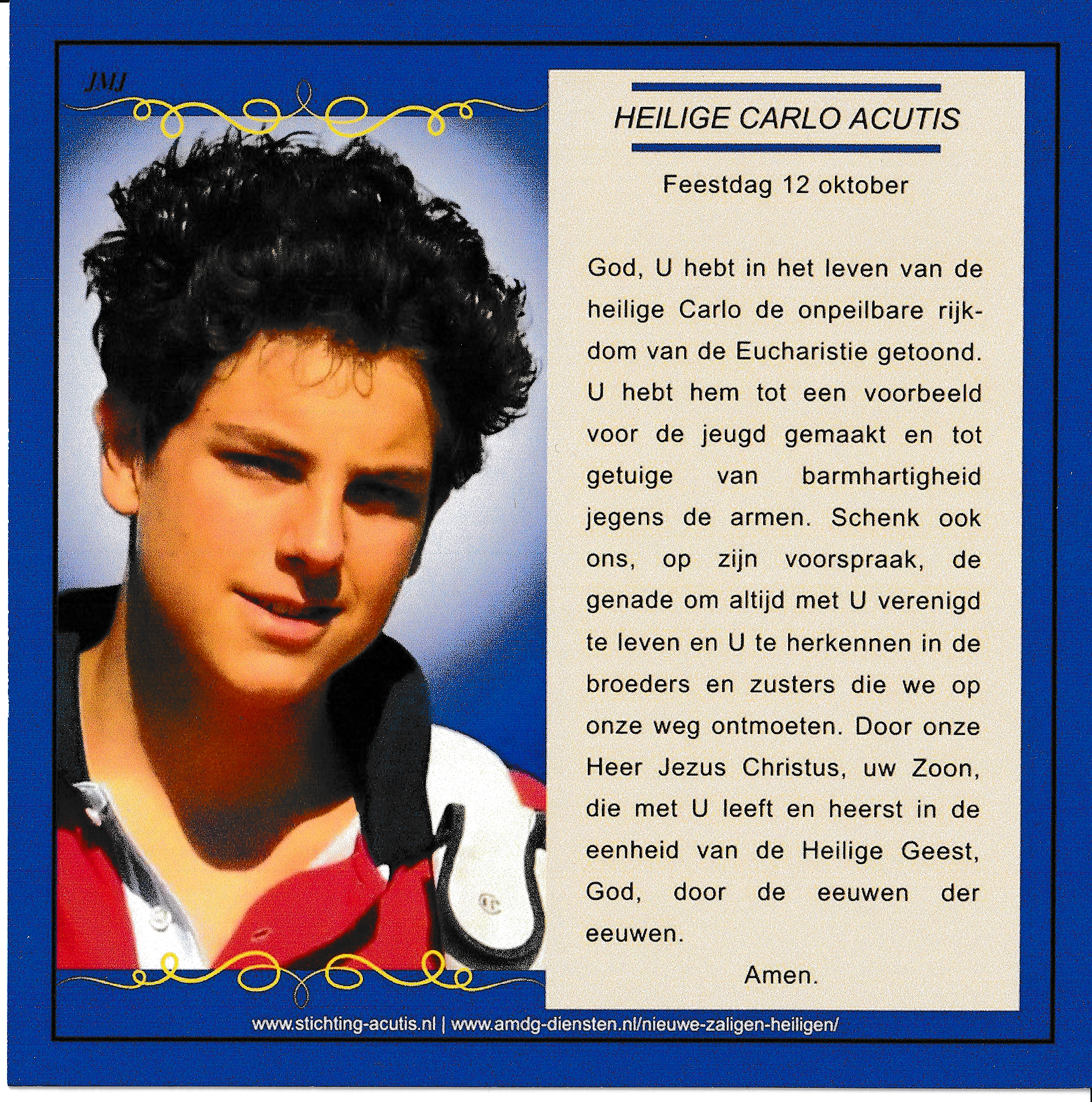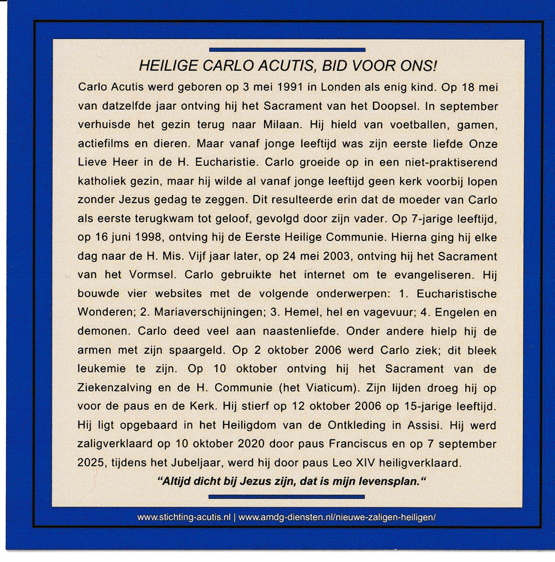 Op 7 september 2025 is Carlo Acutis heilig verklaard. Ter gelegenheid daarvan brengt Stichting Acutis in samenwerking met nieuwe_zaligen_heiligen een gratis gebedskaartje uit.